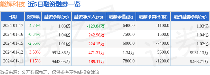 能辉科技融资融券信息显示,融资方面,当日融资买入587.6万元,融资偿还717.44万元,融资净偿还129.84万元。融券方面,融券卖出0.0股,融券偿还1100.0股,融券余量6400.0股,融券余额16.25万元。融资融券余额1.03亿元。近5日融资融券数据一览见下表: