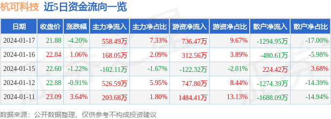 1月17日的资金流向数据方面,主力资金净流入558.49万元,占总成交额7.33%,游资资金净流入736.47万元,占总成交额9.67%,散户资金净流出1294.95万元,占总成交额17.0%。