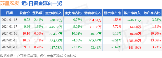 股票行情快报:苏垦农发(601952)1月18日主力资金净卖出48.50万元
