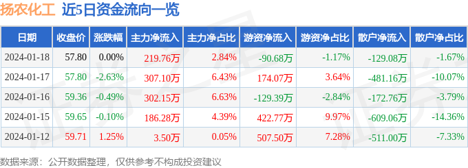 股票行情快报:扬农化工(600486)1月18日主力资金净买入219.76万元