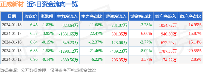 股票行情快报:正威新材(002201)1月18日主力资金净卖出823.64万元