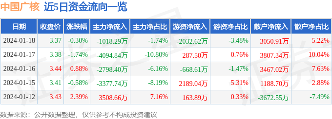 财经消息,截至2024年1月18日收盘,中国广核(003816)报收于3.37元,下跌0.3%,换手率0.45%,成交量176.2万手,成交额5.85亿元。