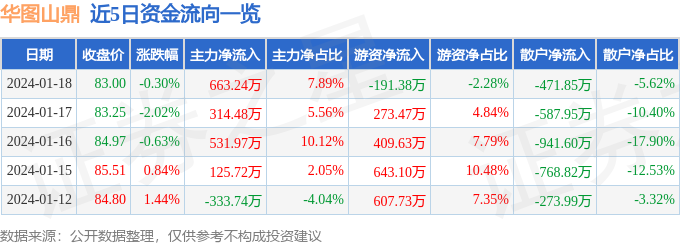 财经消息,截至2024年1月18日收盘,华图山鼎(300492)报收于83.0元,下跌0.3%,换手率0.73%,成交量1.03万手,成交额8401.26万元。
