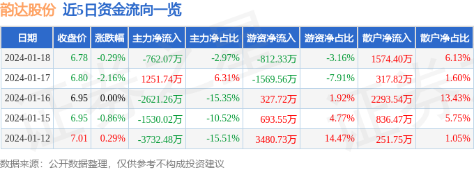 股票行情快报:韵达股份(002120)1月18日主力资金净卖出762.07万元