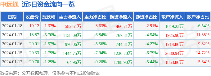 股票行情快报:中远通(301516)1月18日主力资金净买入582.51万元