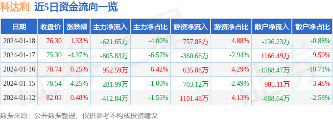 1月18日的资金流向数据方面,主力资金净流出621.65万元,占总成交额4.0%,游资资金净流入757.88万元,占总成交额4.88%,散户资金净流出136.23万元,占总成交额0.88%。