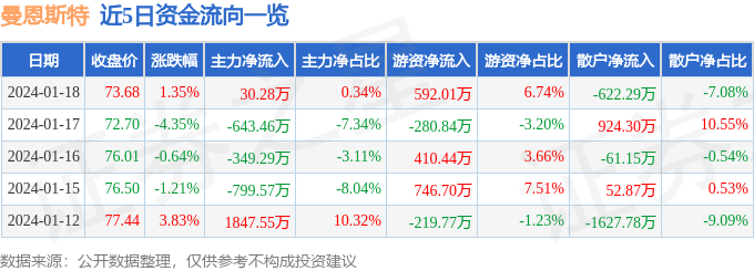 财经消息,截至2024年1月18日收盘,曼恩斯特(301325)报收于73.68元,上涨1.35%,换手率4.61%,成交量1.21万手,成交额8785.27万元。