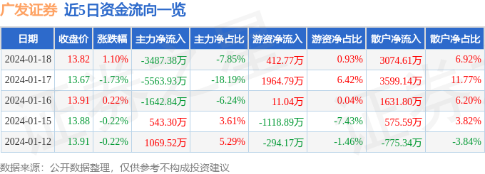 股票行情快报:广发证券(000776)1月18日主力资金净卖出3487.38万元