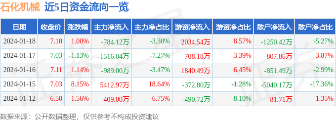 财经消息,截至2024年1月18日收盘,石化机械(000852)报收于7.1元,上涨1.0%,换手率3.79%,成交量34.28万手,成交额2.37亿元。