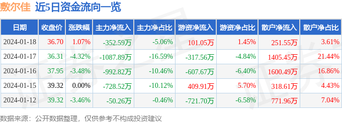 股票行情快报:敷尔佳(301371)1月18日主力资金净卖出352.59万元