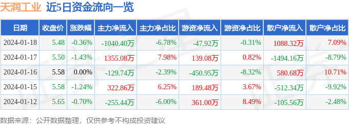 财经消息,截至2024年1月18日收盘,天润工业(002283)报收于5.48元,下跌0.36%,换手率2.82%,成交量28.33万手,成交额1.53亿元。