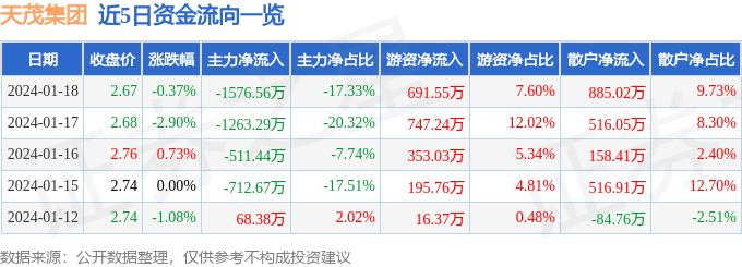 股票行情快报:天茂集团(000627)1月18日主力资金净卖出1576.56万元