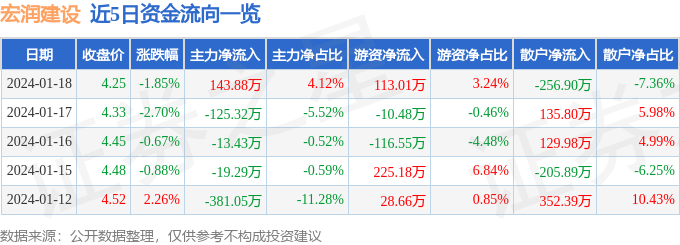 财经消息,截至2024年1月18日收盘,宏润建设(002062)报收于4.25元,下跌1.85%,换手率0.83%,成交量8.26万手,成交额3492.52万元。