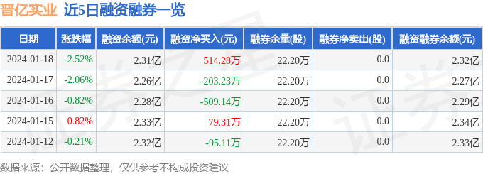 晋亿实业融资融券信息显示,融资方面,当日融资买入907.77万元,融资偿还393.49万元,融资净买入514.28万元。融券方面,融券卖出0.0股,融券偿还0.0股,融券余量22.2万股,融券余额103.01万元。融资融券余额2.32亿元。近5日融资融券数据一览见下表: