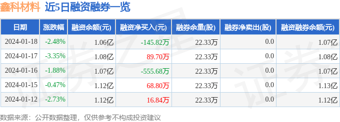 鑫科材料融资融券信息显示,融资方面,当日融资买入595.88万元,融资偿还741.7万元,融资净偿还145.82万元。融券方面,融券卖出0.0股,融券偿还0.0股,融券余量22.33万股,融券余额43.99万元。融资融券余额1.07亿元。近5日融资融券数据一览见下表: