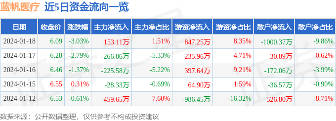 蓝帆医疗(002382)1月18日主力资金净买入153.11万元