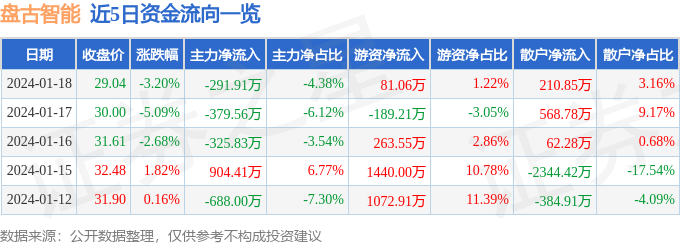 财经消息,截至2024年1月18日收盘,盘古智能(301456)报收于29.04元,下跌3.2%,换手率6.31%,成交量2.31万手,成交额6663.81万元。