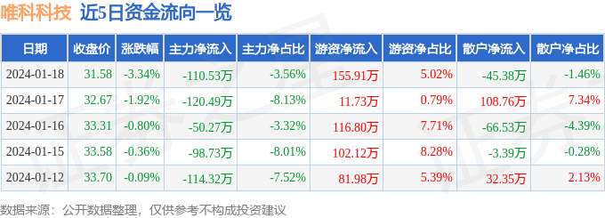 唯科科技(301196)1月18日主力资金净卖出110.53万元