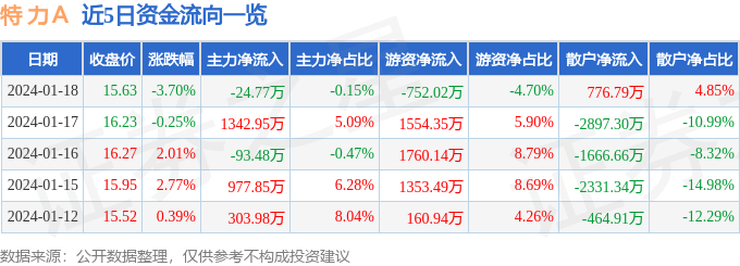 特力A(000025)1月18日主力资金净卖出24.77万元