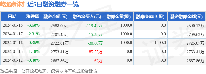 屹通新材融资融券信息显示,融资方面,当日融资买入163.53万元,融资偿还282.96万元,融资净偿还119.42万元。融券方面,融券卖出0.0股,融券偿还0.0股,融券余量1000.0股,融券余额2.12万元。融资融券余额2590.12万元。近5日融资融券数据一览见下表: