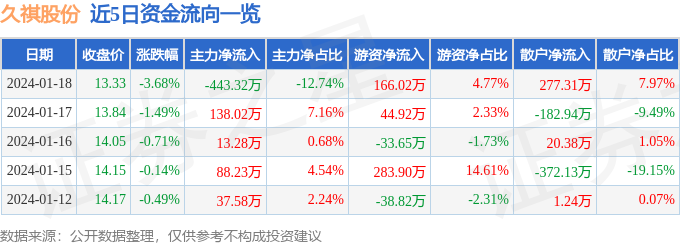 久祺股份(300994)1月18日主力资金净卖出443.32万元
