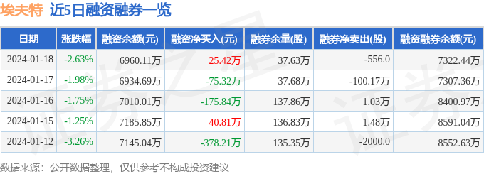 埃夫特融资融券信息显示,融资方面,当日融资买入443.47万元,融资偿还418.05万元,融资净买入25.42万元。融券方面,融券卖出1.92万股,融券偿还1.98万股,融券余量37.63万股,融券余额362.33万元。融资融券余额7322.44万元。近5日融资融券数据一览见下表: