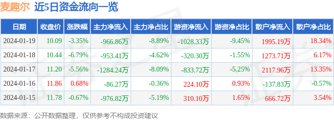 麦趣尔(002719)1月19日主力资金净卖出966.86万元