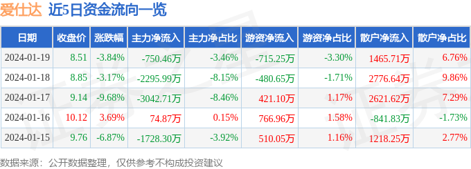 财经消息,截至2024年1月19日收盘,爱仕达(002403)报收于8.51元,下跌3.84%,换手率8.22%,成交量25.16万手,成交额2.17亿元。