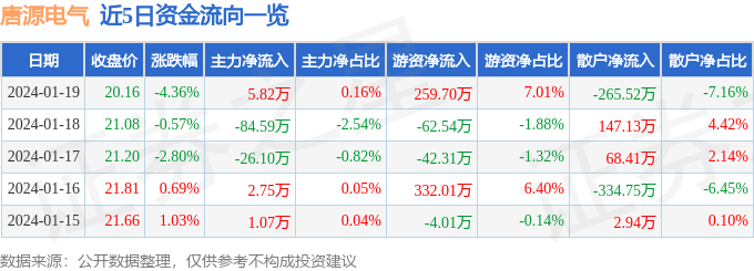 财经消息,截至2024年1月19日收盘,唐源电气(300789)报收于20.16元,下跌4.36%,换手率2.43%,成交量1.83万手,成交额3706.79万元。