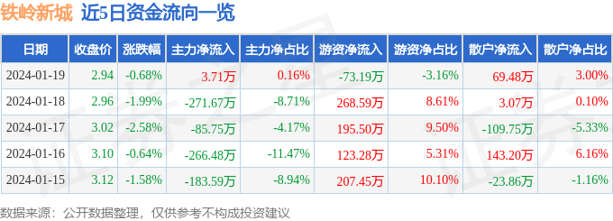 股票行情快报:铁岭新城(000809)1月19日主力资金净买入3.71万元