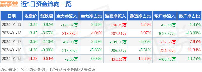 股票行情快报:嘉事堂(002462)1月19日主力资金净卖出129.82万元
