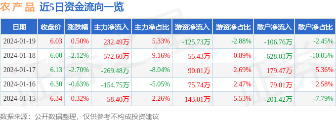 财经消息,截至2024年1月19日收盘,农 产 品(000061)报收于6.03元,上涨0.5%,换手率0.43%,成交量7.22万手,成交额4360.65万元。