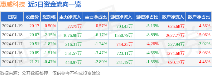 股票行情快报:惠威科技(002888)1月19日主力资金净买入77.75万元