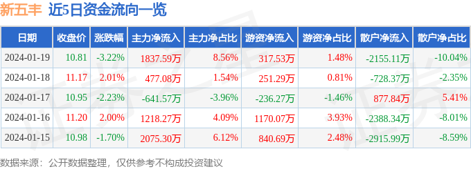 新五丰(600975)1月19日主力资金净买入1837.59万元
