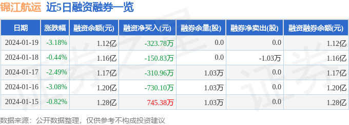 锦江航运融资融券信息显示,融资方面,当日融资买入890.42万元,融资偿还1214.2万元,融资净偿还323.78万元。融券方面,融券卖出0.0股,融券偿还0.0股,融券余量0.0股,融券余额0.0万元。融资融券余额1.12亿元。近5日融资融券数据一览见下表: