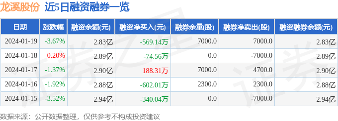 龙溪股份融资融券信息显示,融资方面,当日融资买入861.09万元,融资偿还1430.24万元,融资净偿还569.14万元。融券方面,融券卖出7000.0股,融券偿还0.0股,融券余量7000.0股,融券余额6.8万元。融资融券余额2.83亿元。近5日融资融券数据一览见下表:
