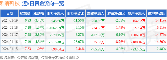 1月19日的资金流向数据方面,主力资金净流出945.66万元,占总成交额11.56%,游资资金净流出208.36万元,占总成交额2.55%,散户资金净流入1154.02万元,占总成交额14.11%。