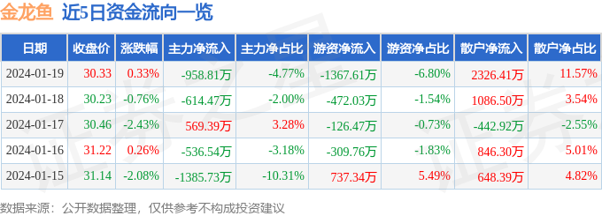 财经消息,截至2024年1月19日收盘,金龙鱼(300999)报收于30.33元,上涨0.33%,换手率1.22%,成交量6.64万手,成交额2.01亿元。