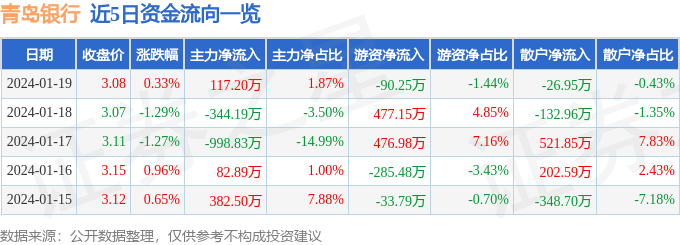 财经消息,截至2024年1月19日收盘,青岛银行(002948)报收于3.08元,上涨0.33%,换手率0.65%,成交量20.33万手,成交额6265.24万元。