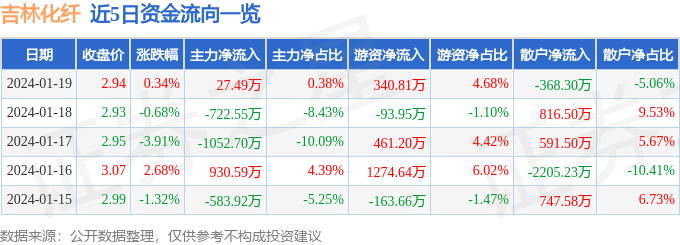 财经消息,截至2024年1月19日收盘,吉林化纤(000420)报收于2.94元,上涨0.34%,换手率1.0%,成交量24.59万手,成交额7282.3万元。