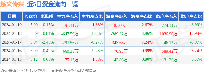 股票行情快报:慈文传媒(002343)1月19日主力资金净买入91.14万元