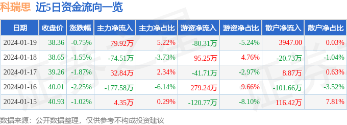 1月19日的资金流向数据方面,主力资金净流入79.92万元,占总成交额5.22%,游资资金净流出80.31万元,占总成交额5.24%,散户资金净流入0.39万元,占总成交额0.03%。