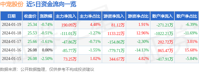 股票行情快报:中宠股份(002891)1月19日主力资金净买入190.09万元