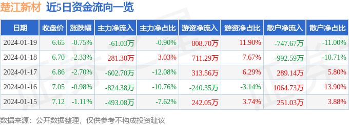 股票行情快报:楚江新材(002171)1月19日主力资金净卖出61.03万元