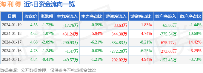 财经消息,截至2024年1月19日收盘,海 利 得(002206)报收于4.55元,下跌1.73%,换手率1.08%,成交量9.93万手,成交额4578.49万元。