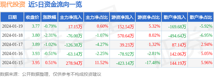 财经消息,截至2024年1月19日收盘,现代投资(000900)报收于3.77元,下跌0.79%,换手率0.5%,成交量7.59万手,成交额2865.24万元。