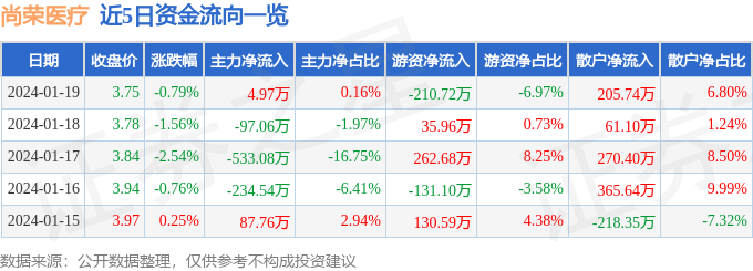 股票行情快报:尚荣医疗(002551)1月19日主力资金净买入4.97万元
