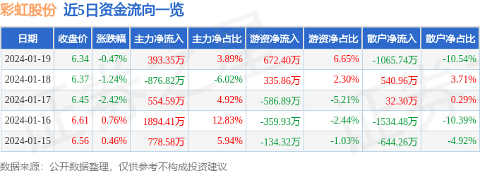 财经消息,截至2024年1月19日收盘,彩虹股份(600707)报收于6.34元,下跌0.47%,换手率0.44%,成交量15.92万手,成交额1.01亿元。