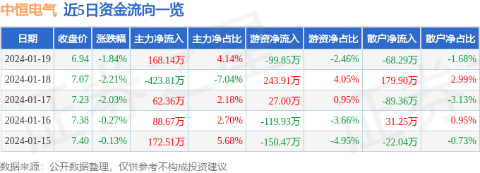 股票行情快报:中恒电气(002364)1月19日主力资金净买入168.14万元