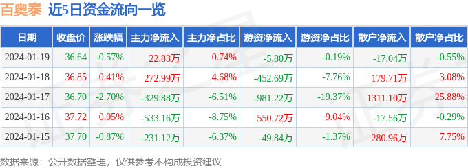 股票行情快报:百奥泰(688177)1月19日主力资金净买入22.83万元